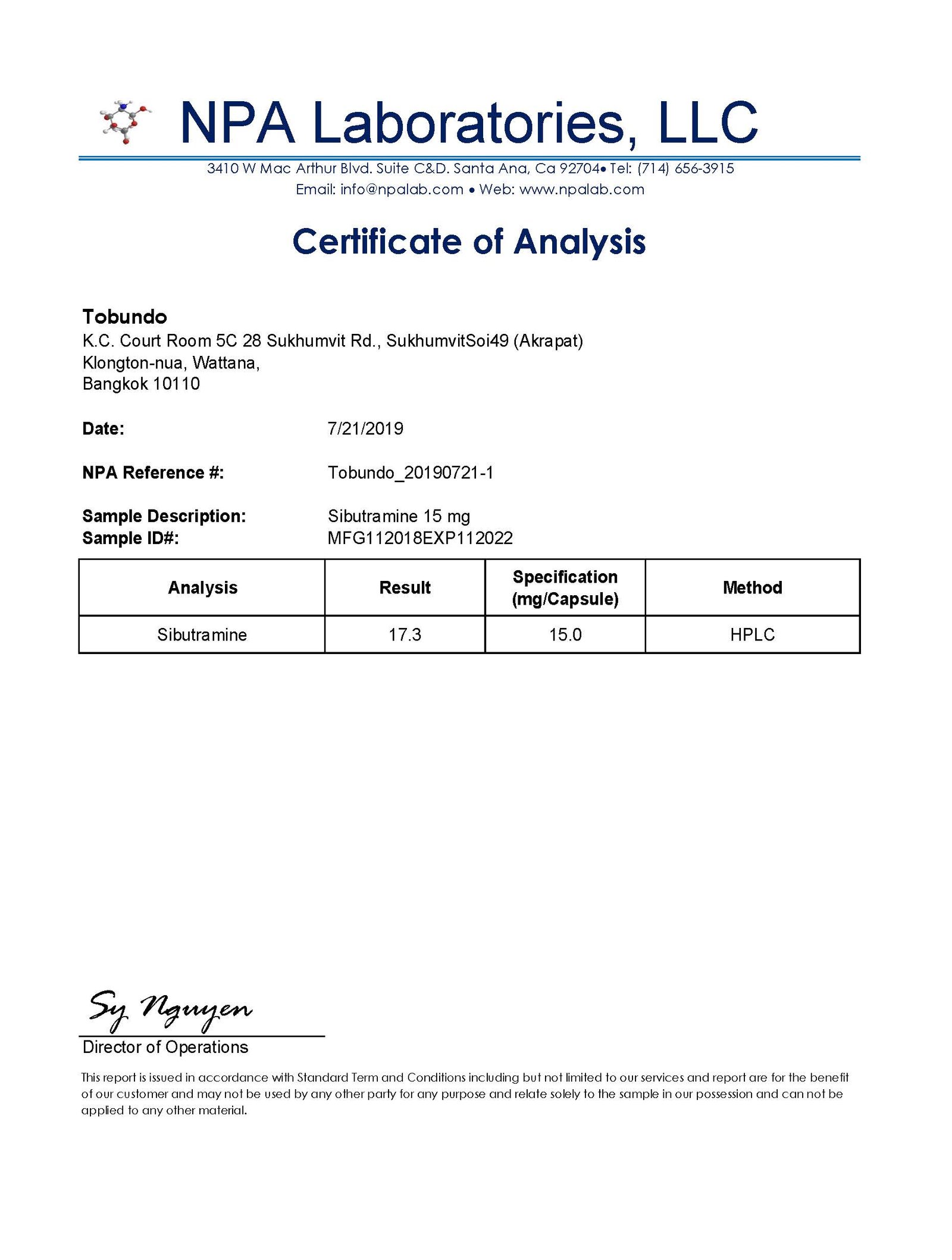 検査所が任意に取り出した1カプセルより15.5mlのシブトラミンが検出されました。